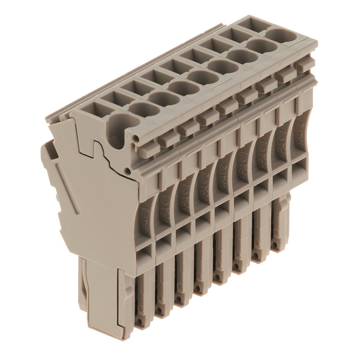 Stik for rækkeklemme med 2,5mm2, 500V, 24A og 9 poler i beige farve fra Weidmüller. Ideel til sikker og pålidelig stikforbindelse.