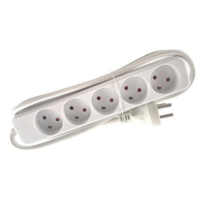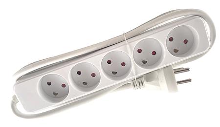 Stikkontaktdåse, 16A, DK, 5 udtag, med jord, uden afbryder, 1,5 meter ledning, hvid.