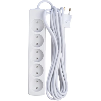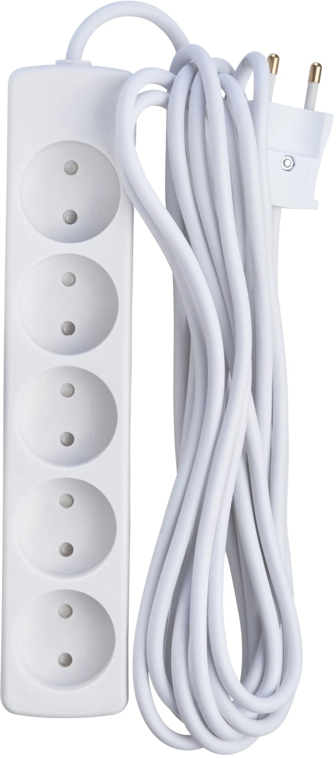 5-stikdåse uden jord med 5 meter ledning 2x1 mm² H05VV-F, hvid. Uden afbryder og med dummyhul.