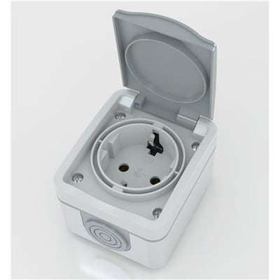 Enkelt schuko stikdåse med IP54 klassificering i grå.