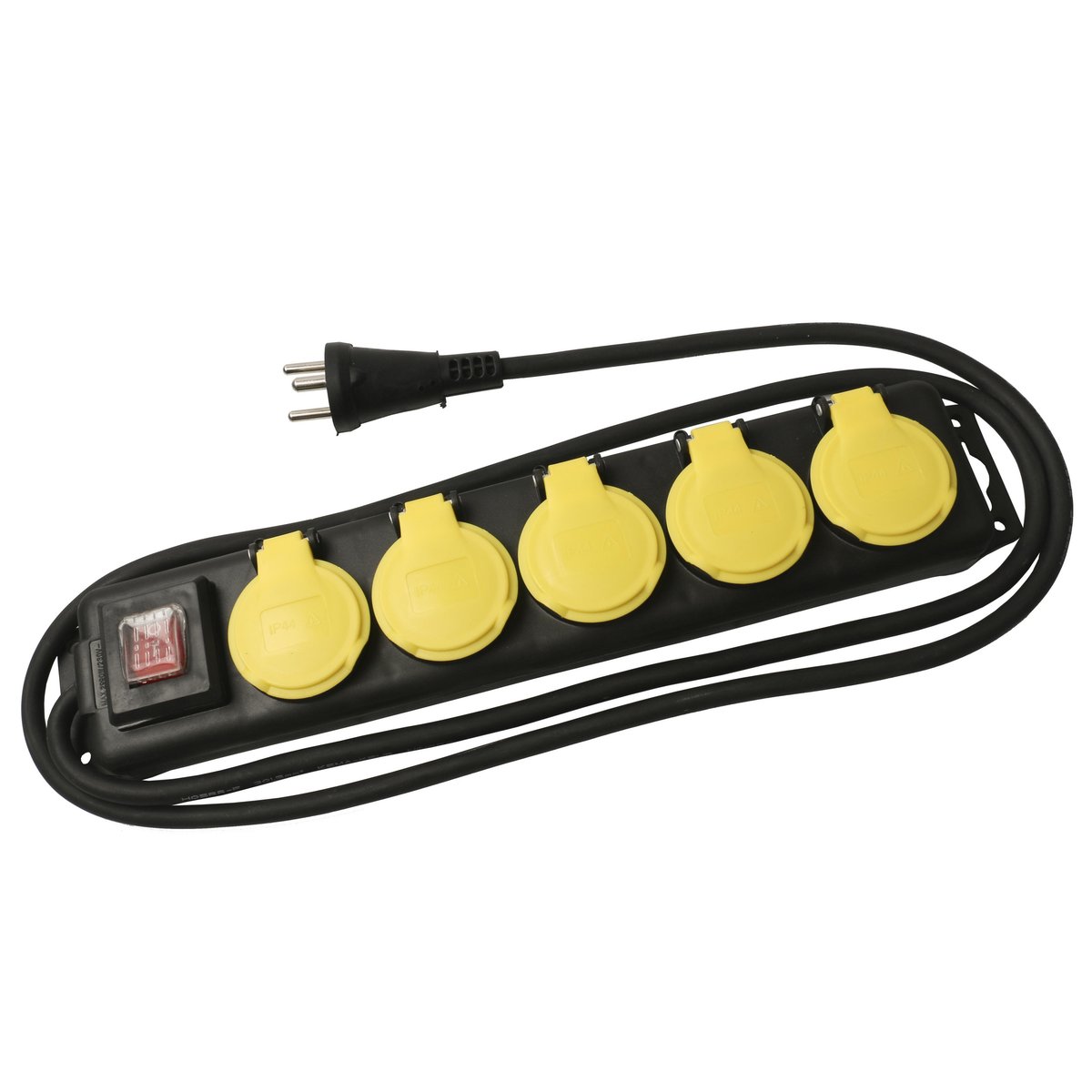 Professionel stikdåse med 5 udtag, jordforbindelse, 1,5 meter kabel og IP44-klassificering. Inkluderer afbryder og H05RR-F 3G1,5mm2 kabel.