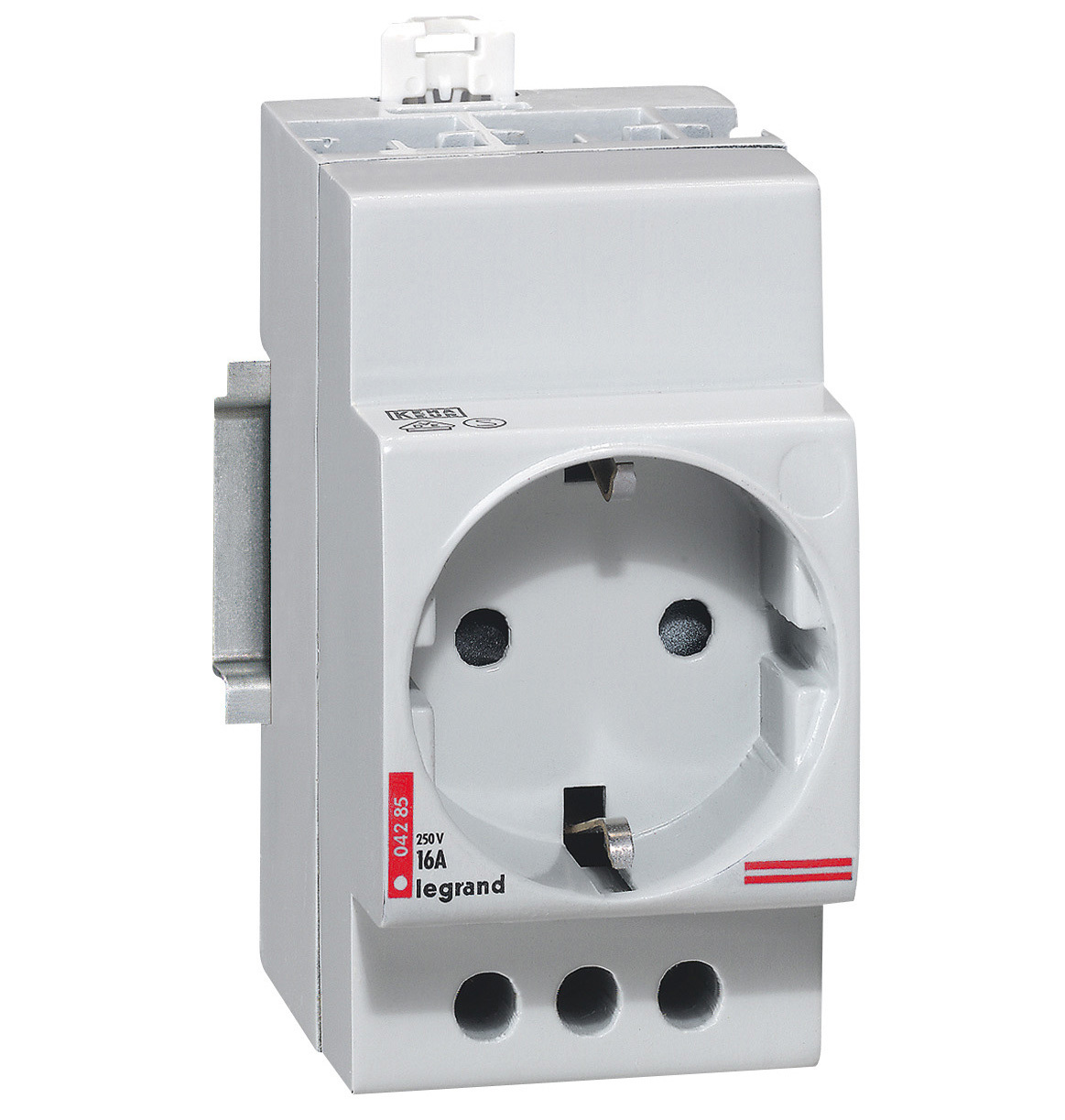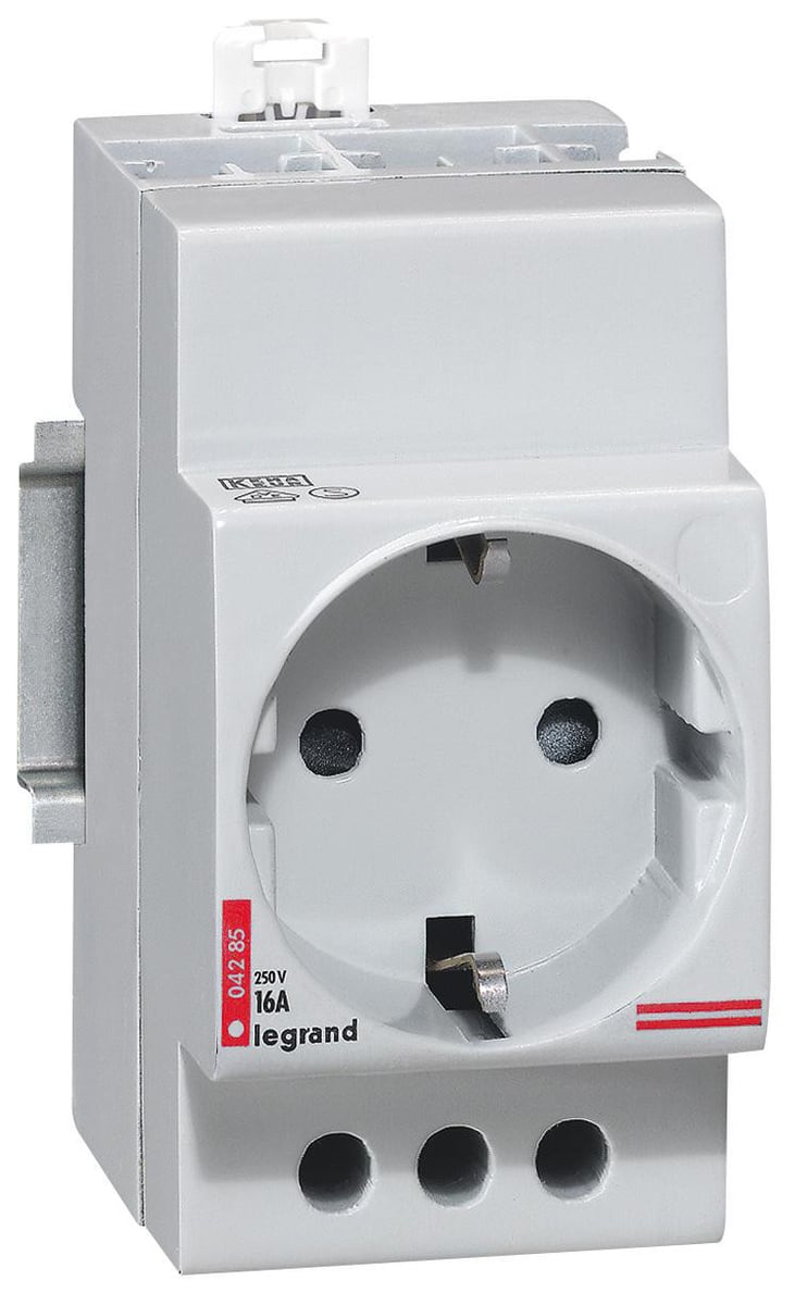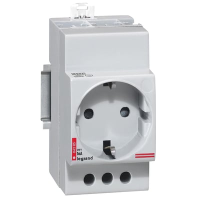 Stikdåse til DIN-skinne. 2P+J Schuko, 10/16A - 250V, tysk standard, 2,5 modul. Må kun installeres i tavler på nye maskiner omfattet af maskindirektivet eller til eksport.