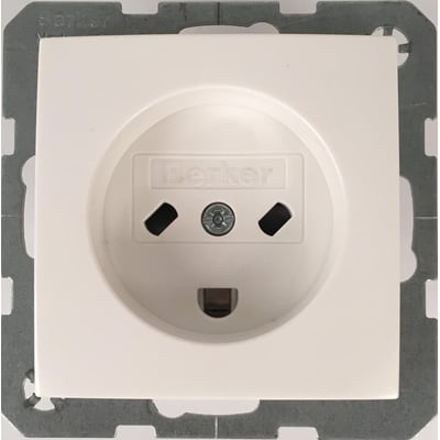 Berker stikkontakt i dansk udførelse. Denne 3-polede stikkontakt er med dansk jord og passer ind i EDB designserien S./B. Farven er hvid (RAL 9010).