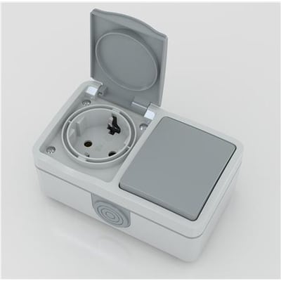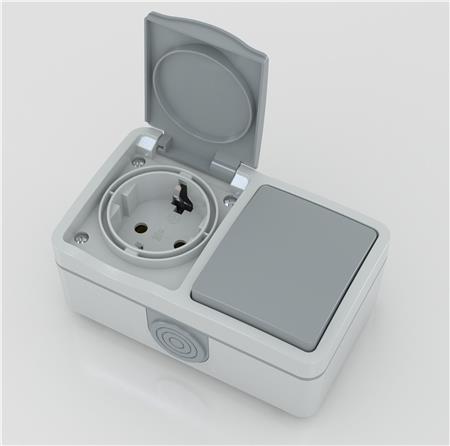 Stikkontakt med afbryder, schuko, IP54, grå.