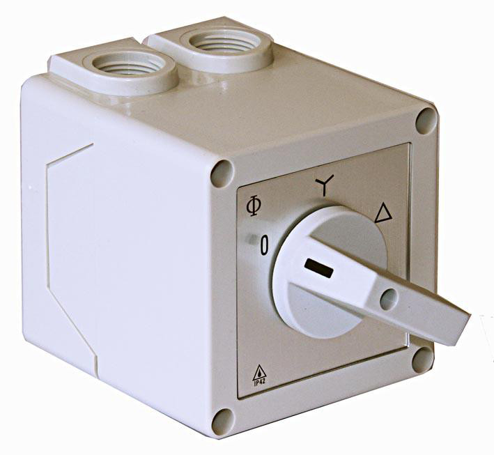 Kraus & Naimer omskifter i en stjerne-trekant version. Funktion 0-Y-D, 60 graders vinkel. Kompakt størrelse og gevindindgange. Mulighed for indbygget lampe med eventuel beskyttende jordterminal.