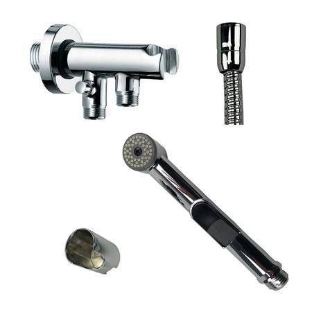 Stopventil med 2 udgange og bidetbruser med stop, inklusive holder. Fremstillet i metal og forkromet plast.