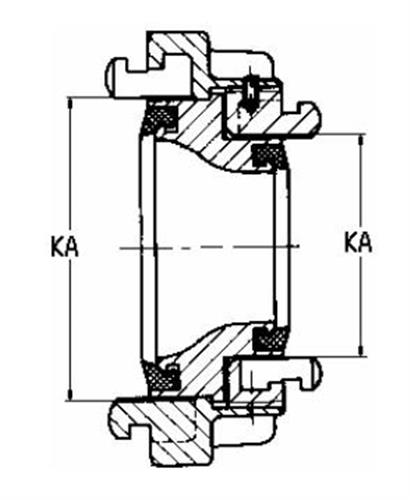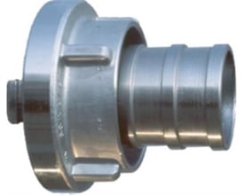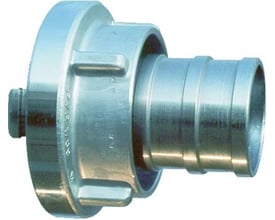 Storz overgangsstykke i aluminium. Koblinger er fremstillet iht. DIN-forskrifterne. DIN koblingen adskiller sig fra "Industri koblingen" ved at have smedet knager/kroge og ikke støbte. Til granulattransport anvendes hvid koblingspakning.