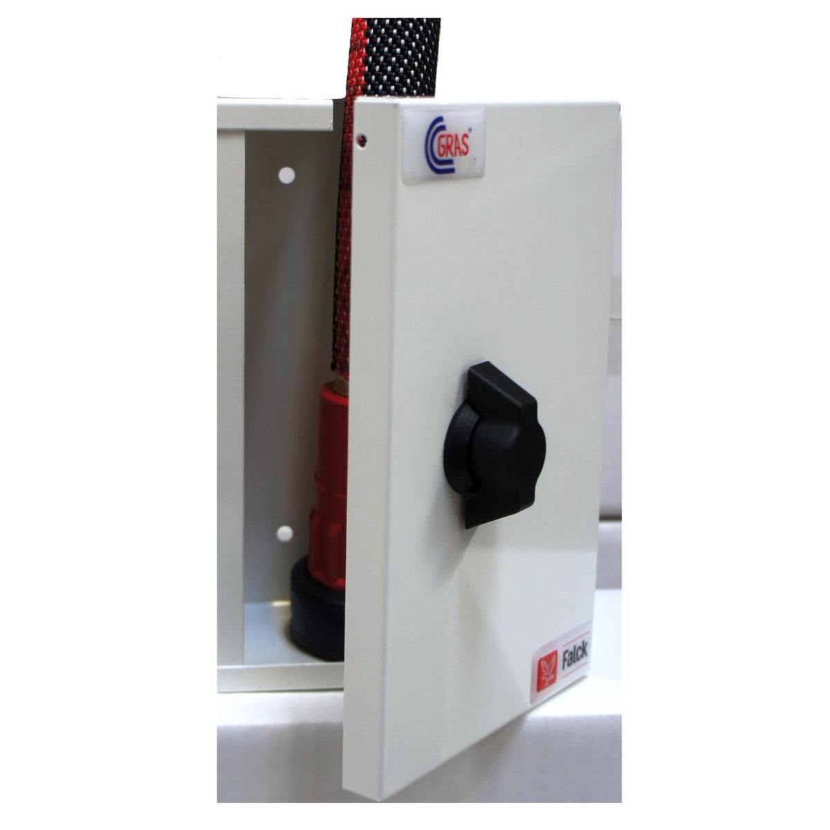 Strålerørsskab til beskyttelse af strålerør, ideelt til brug sammen med slangevinder, hvor slangen føres ned langs væggen. Skabet forhindrer uvedkommende adgang til strålerøret.