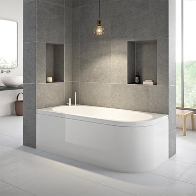 Frontpanel fra Strømberg i hvid sanitetsakryl med Carronite forstærkning. Leveres med justerbare ben.