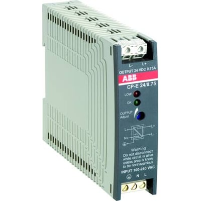 1-faset switch-mode strømforsyning i CP-E serien. Indgang 100-240V AC, udgang 24VDC ved 0,75A. Effekt 18W.
