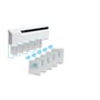 Rumtermostaterne er allerede indkodet, og telestaterne er monteret i styreboksen. Systemet er pakket, monteret og programmeret i en kasse, hvilket gør installationen hurtig og nem.