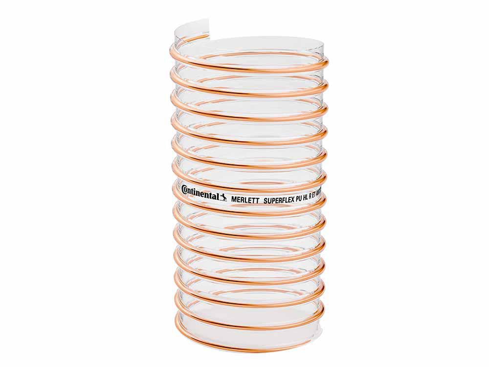 FDA fødevaregodkendt PU slange med kobberbelagt stålspiral, godstykkelse 0,9mm. Velegnet til ventilation og lettere materialetransport.