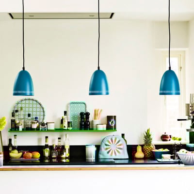 Superliving Dynamo pendel i mat petrol med udstansede huller, sort silikoneledning og E27 porcelænsfatning. Industrielt design til den moderne bolig.