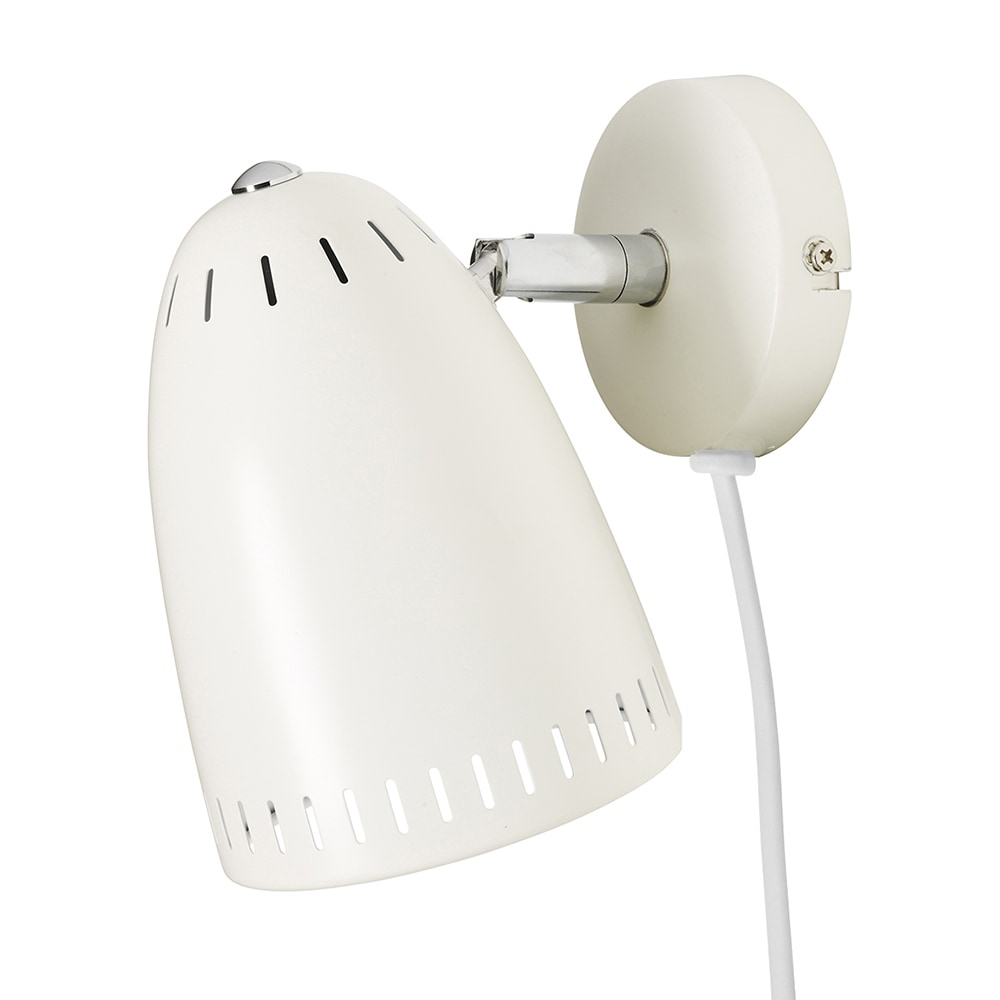 Superliving Dynamo væglampe med kort arm i mat hvid metal. Skærmen har udstansede huller og et drejeled, der kan reguleres 345 grader, hvilket giver stor fleksibilitet i lysretningen.