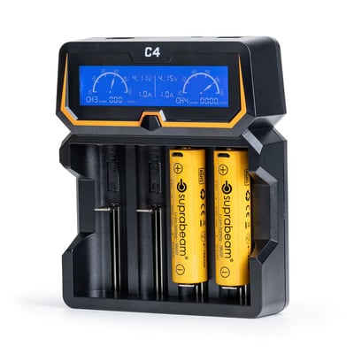 Suprabeam C4 Multi Charger til lynhurtig opladning af op til 4 batterier ad gangen. Fungerer også som powerbank med USB-A-udgang. Leveres med 2 stk. 18650 3000mAh batterier.