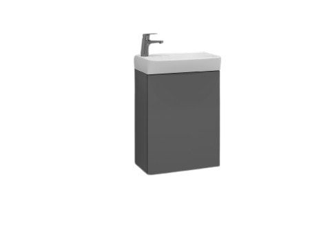 Svedbergs Bloc underskab i grå melamin, 45x25 cm, med en venstrevendt låge og soft close-funktion. Perfekt til opbevaring på badeværelset.