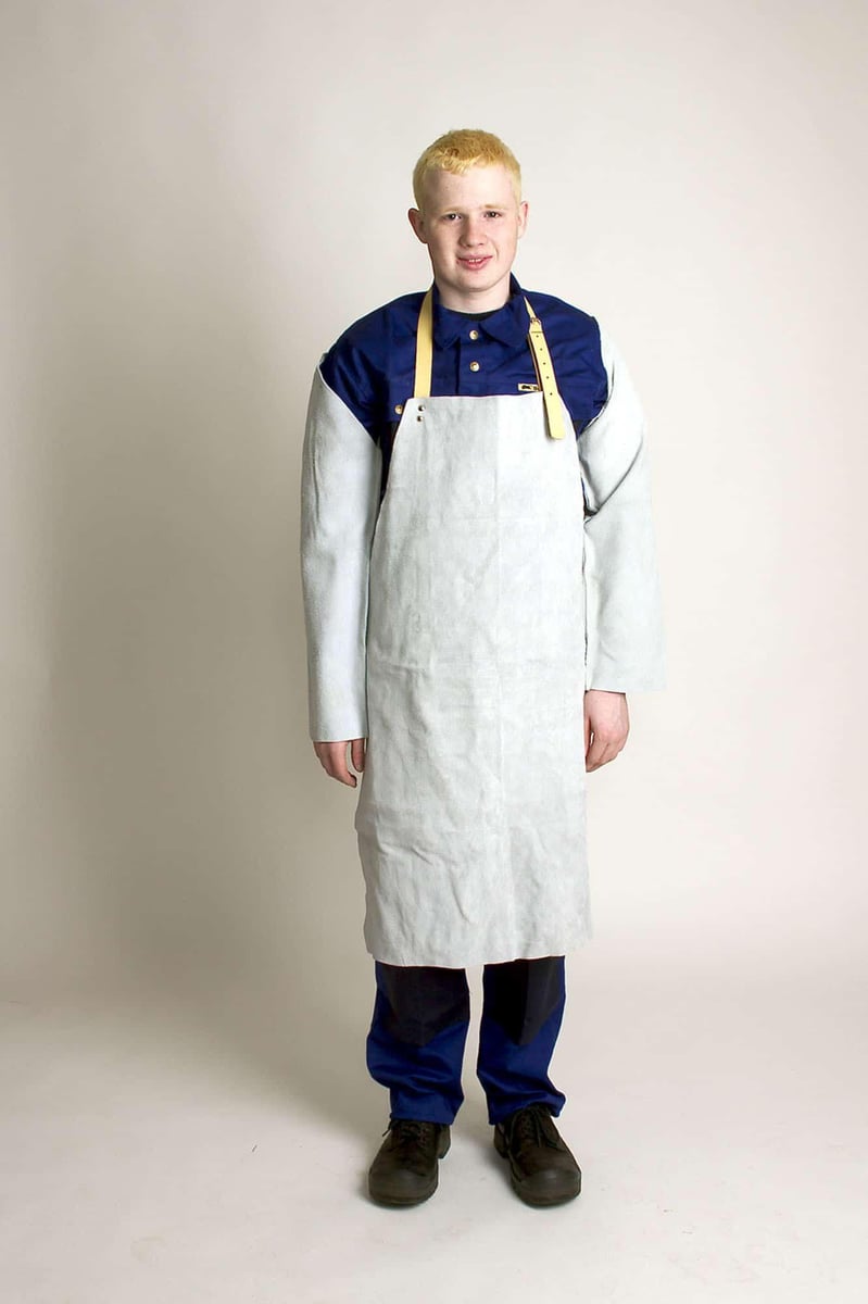 Beskyt dit tøj med et klassisk værkstedsforklæde af oksespalt og læder. Perfekt til svejsearbejde og andre opgaver, hvor du har brug for slidstærk beskyttelse.