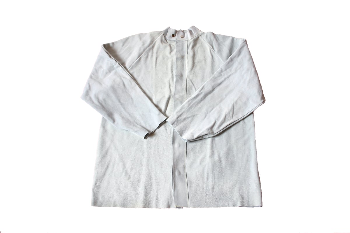 Kort svejsejakke i oksespalt med trykknapper og Kevlar tråd. Tykkelse: 1,6 - 1,8 mm. Størrelse: L. Velegnet til svejsere og smede.