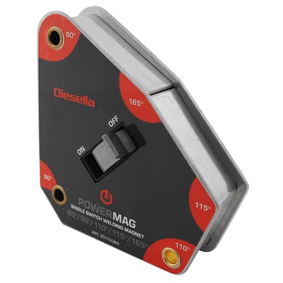 Kraftig svejsemagnet med on/off funktion, ideel til professionelle opgaver. Kan bruges til vinkler fra 60° til 165°. Mål: 105 x 29 x 110 mm.