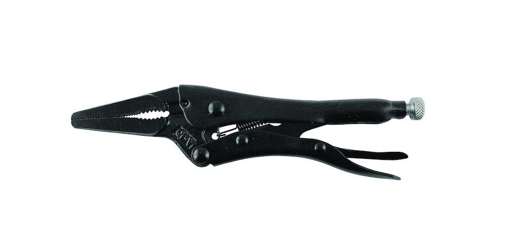 WLDPRO svejsetang med lange, smalle kæber til steder med begrænset plads. Med indstillingsskrue, udløserhåndtag og sort-oxideret overflade. Længde: 125 mm. Spændvidde: 35 mm.