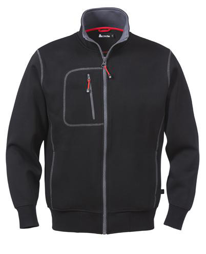 Sweatshirt i double face kvalitet med rød kontrast i krave og på lynlås puller. Udstyret med to forlommer, en brystlomme med lynlås, samt manchetter og ribkant med elasthan.
