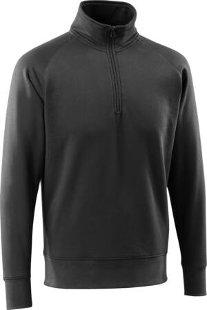 Lækker sweatshirt i sort fra Mascot. Kæmmet bomuld, børstet inderside og moderne pasform. Med lynlås i hals, rib i nedre kant og ved håndled, nakkebelægning og nakkebånd.