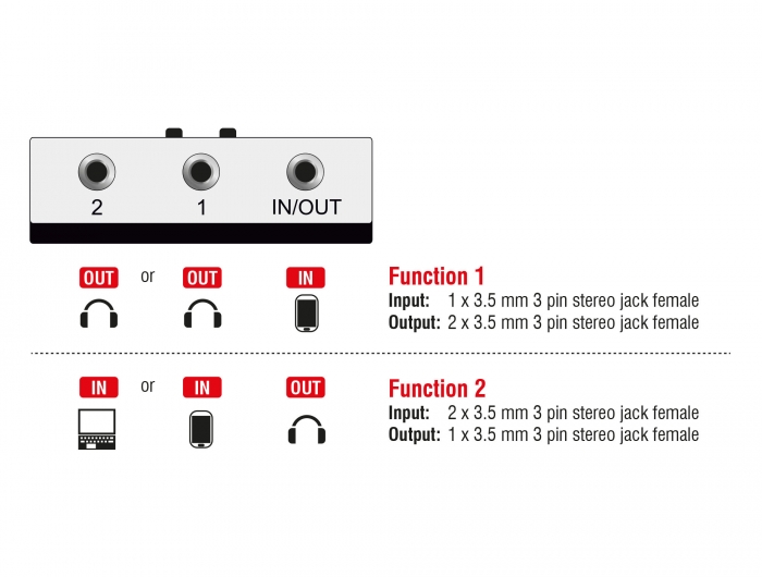 Denne Delock stereo jack 3,5 mm switch giver dig mulighed for manuelt at skifte mellem to forskellige lydenheder. Den understøtter to anvendelsesmuligheder.