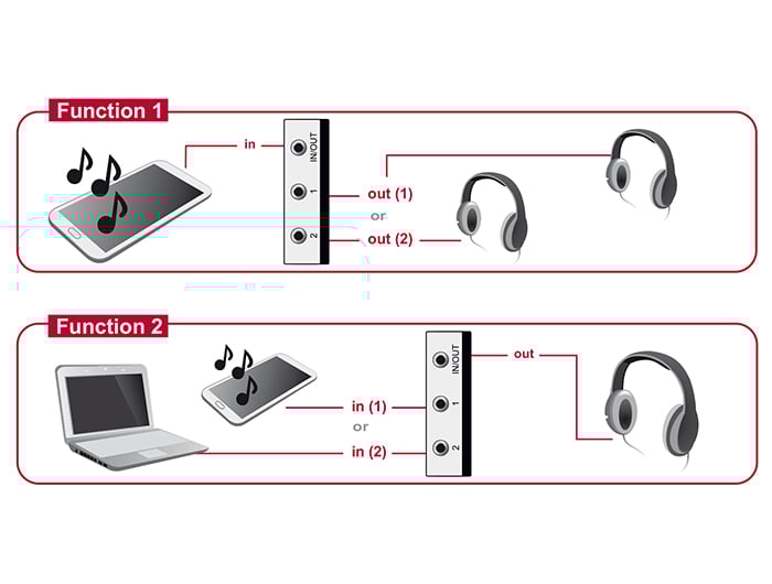 Switchen muliggør en nem og hurtig skift mellem to kilder, der begge bruger 3,5 mm stereo jack-forbindelser. Den er ideel til situationer, hvor du ønsker at tilslutte flere enheder til én udgang, eller omvendt, at skifte mellem to udgange fra én kilde.