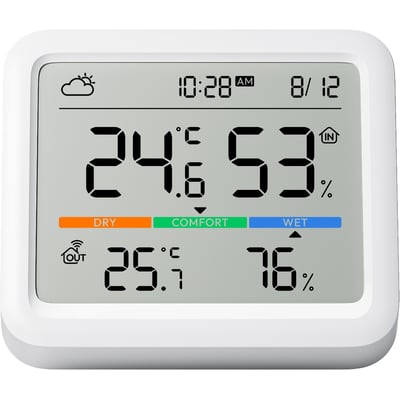 Kombinerer temperatur, fugtighed, tid, dato, komfortniveau og vejrudsigt (SwitchBot Hub påkrævet) i et enkelt overblik. Hold dig informeret om miljøændringer for at skabe et behageligt opholdsrum.