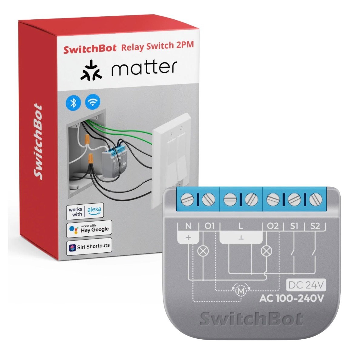 Med Matter-certificering kan du aktivere to SwitchBot Bluetooth-enheder til at understøtte Matter ved at forbinde dem til SwitchBot Relay Switch 2PM. Dette giver dig mulighed for at styre dem direkte via platforme som Apple Home, Alexa, Google Home og SmartThings, alt sammen fra en enkelt app.