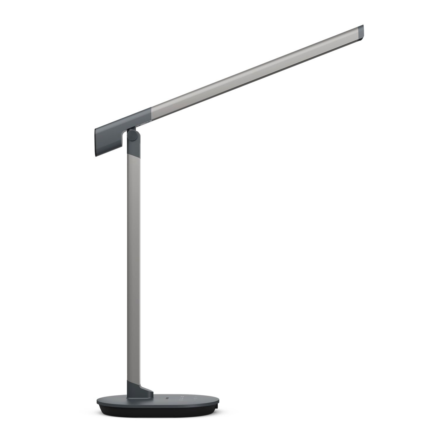 Elegant grå bordlampe med justerbar lysstyrke og farvetemperatur. Perfekt til indendørs brug.