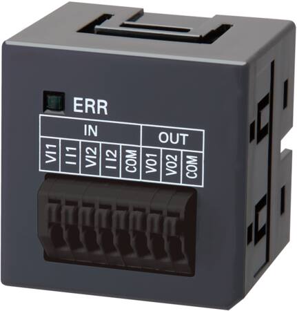 Sysmac NX1P analog I/O skrueløse optionskort med 2 analoge indgange (0 til 10 V) og opløsning på 1:4000 eller 0 til 20 mA og opløsning på 1:2000. Har 2 analoge udgange (0 til 10 V).