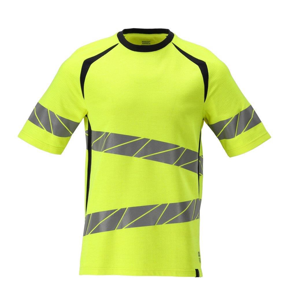 T-shirt med tofarvet, fluorescerende design og skrå, tværgående reflekser. Antistatisk og flammehæmmende med moderne pasform.