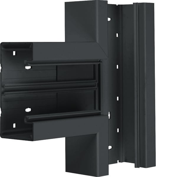 T-stykke til BR65130. Montage: T-stykket monteres, derefter monteres kanalbunde. Samlebeslag skydes ind i T-stykket. Måler 250 mm (top). Materiale: PVC. Farve: RAL 9011.