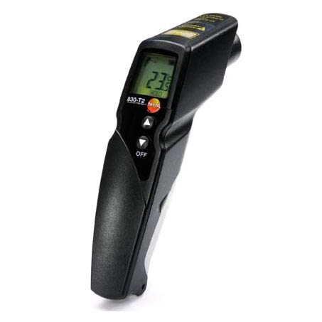 T830-T2 er rar at have i hånden, nem at betjene og særdeles velegnet til alle former for berøringsfri IR temperaturmåling, også på roterende, strømførende, ujævne eller svært tilgængelige emner. Du kan tilslutte en ekstern føler til T830-T2 fx til at fastslå emissionsgrader eller udføre kontrolmålinger. Den dobbelte lasermarkering viser præcist det område du måler på.