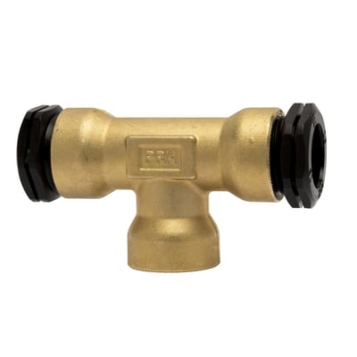 TA PRK fittings af A-metal til PE- og PVC-rør. Med muffe til plastrør på gennemløbet og muffe med rørgevind på grenen.