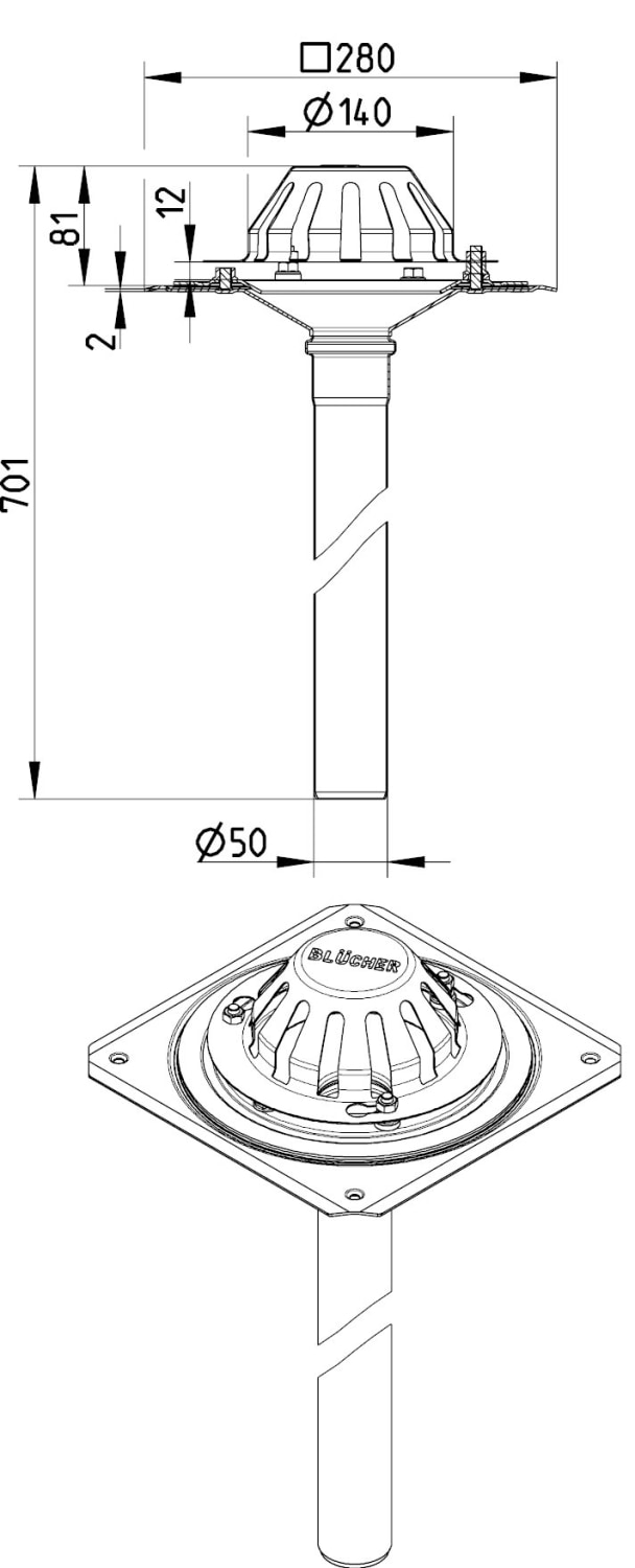 Dette tagafløb fra BLUCHER er designet til selvfald i høje tage og er specielt egnet til tagfolie.