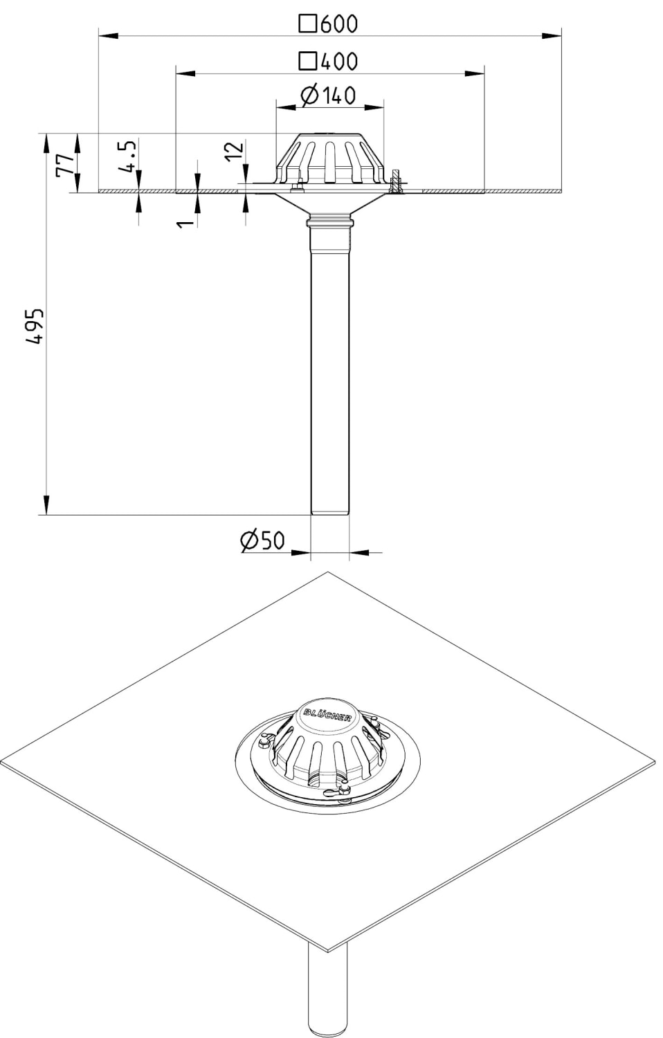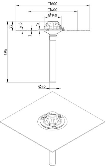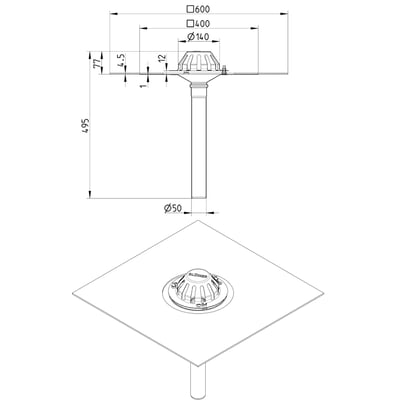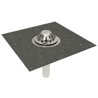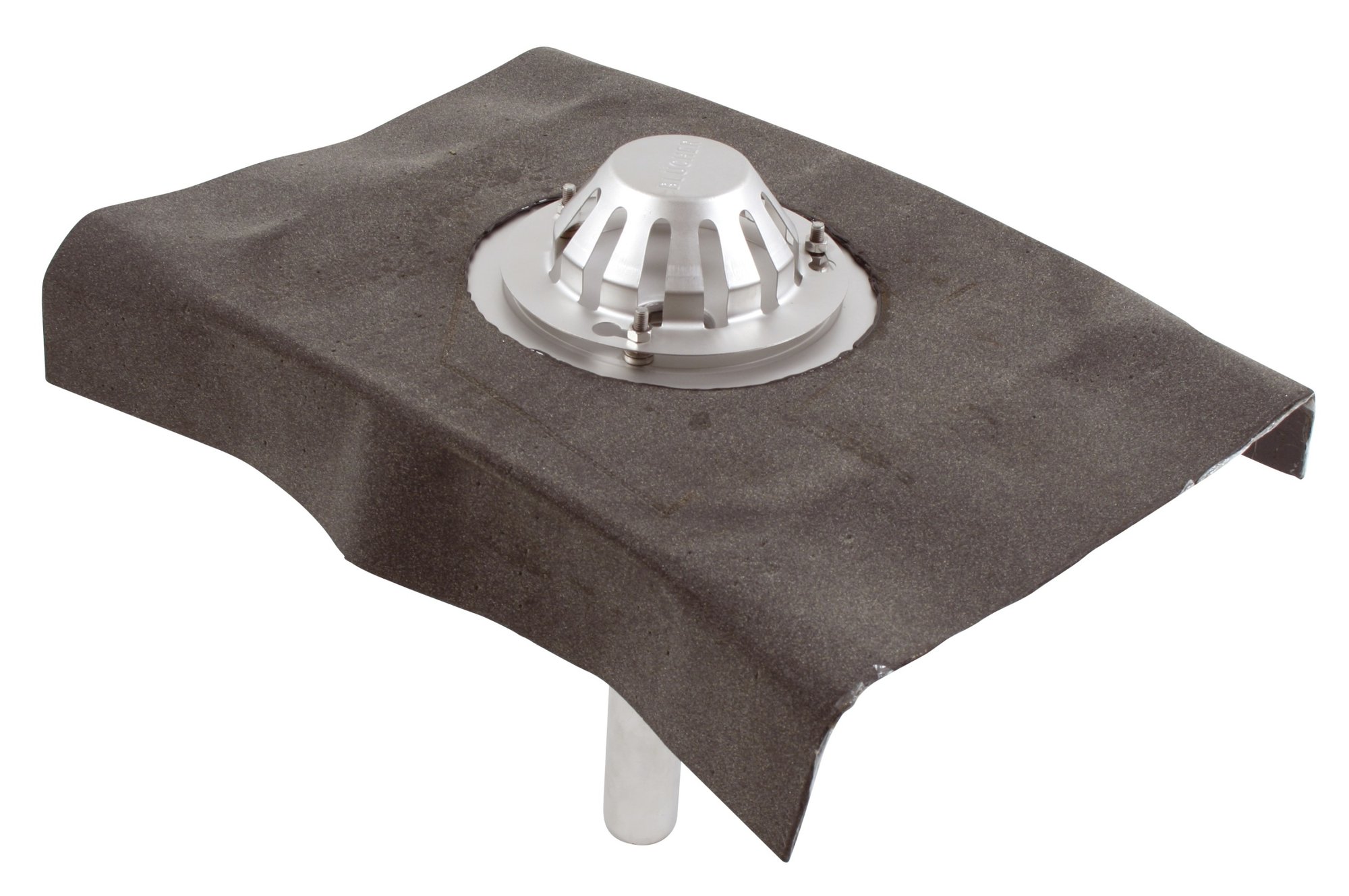 Tagafløb til selvfald med formonteret bitumenkrave. Til tagpap tag. Flange 400 x 400 mm. Udløb Ø50 mm, lodret. Rustfrit stål AISI304/EN1.4301.