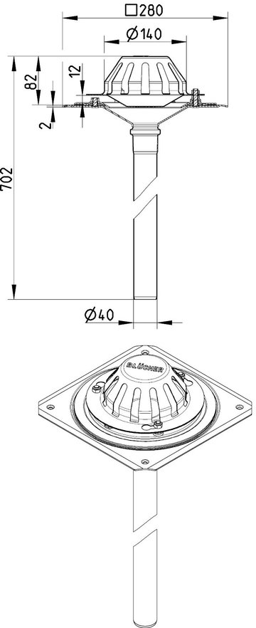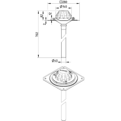 Vakuum tagafløb til høj tagkonstruktion. Med tagfolie-flange på 280x280mm og lodret udløb på Ø40mm.