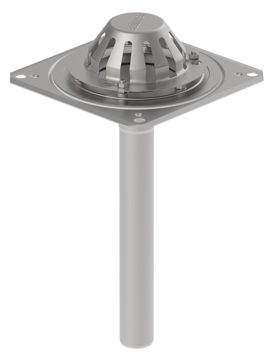 Tagafløb til vakuum-tag med tagfolie-flange. Mål: 280x280mm. Udløb: ø50mm, lodret. Fremstillet i rustfrit stål.