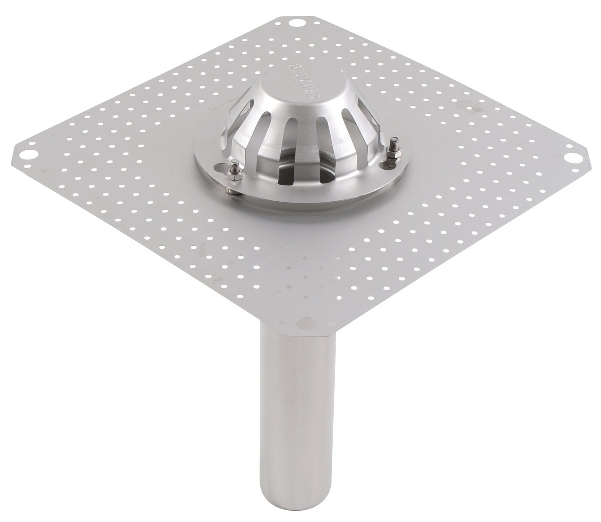 Tagafløb til vakuumtag med tagpap-flange (400x400mm) og lodret udløb på ø75mm. Fremstillet i rustfrit stål AISI304/EN1.4301.