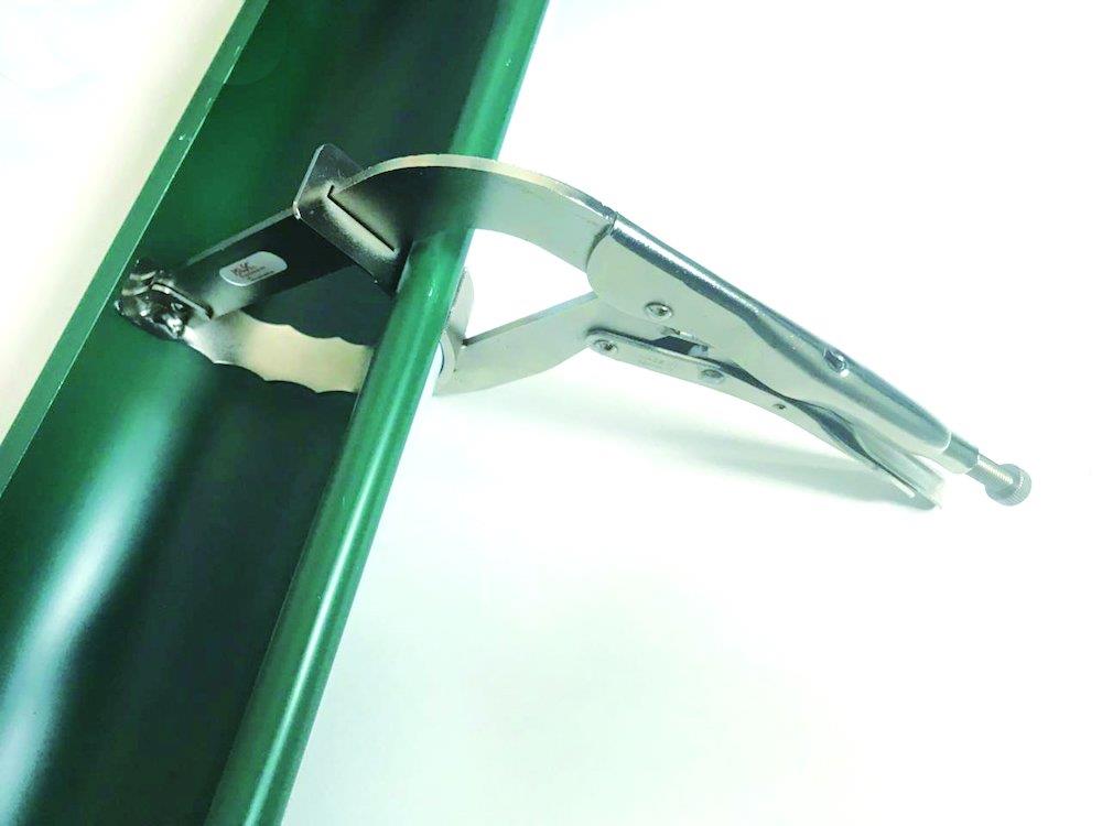 Spændetang til fiksering ved limning og lodning af halvrunde tagrender. Nem tilspænding og med låsefunktion.