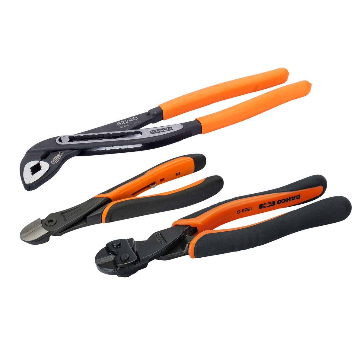 Bahco tangsæt med 3 dele: vandpumpetang 250 mm, sidebidetang 160 mm HD og mini boltsaks 210 mm.