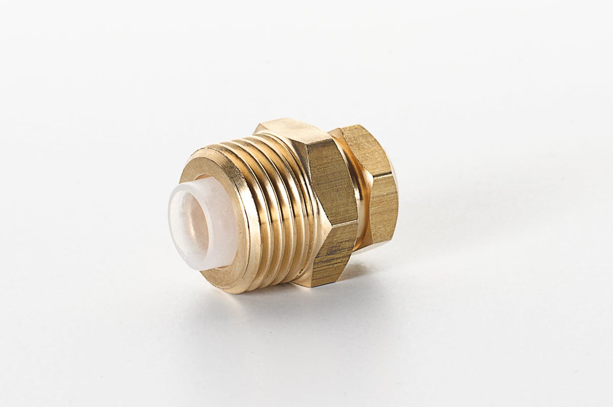 Messingnippel og plastbøsning til olietank. Tåler -60°C til +80°C. Gevind G ifølge DS/ISO 228/1.