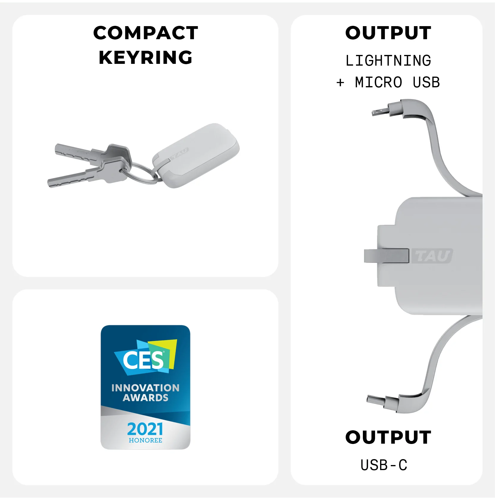 TAU powerbank, 1400 mAh, USB-C/Lightning/Micro USB, hvid