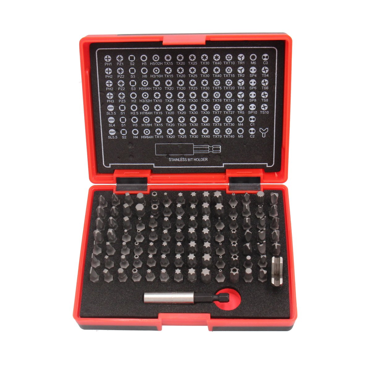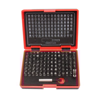 Stort bitssæt med de fleste typer sikkerhedsbits og et stort standardsortiment. Fremstillet af stål i industrikvalitet og hærdet for lang holdbarhed. Leveres i rød nylonboks.