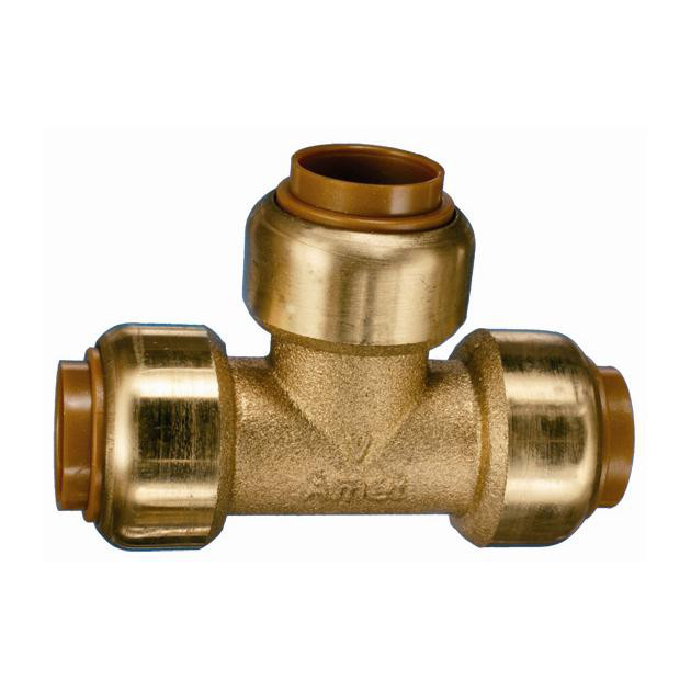 Tectite tee-muffe med muffe/muffe/muffe og en diameter på 18 mm. Koblingen består af 6 dele og er udført i afzinkningsbestandig messing, stål og EPDM-gummi.