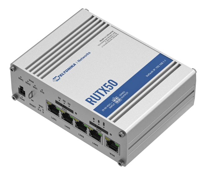 RUTX50 er en dual-SIM multi-netværks router med 5G til højhastigheds dataoverførsel. Med 5x Gigabit Ethernet porte og dual-band Wi-Fi.