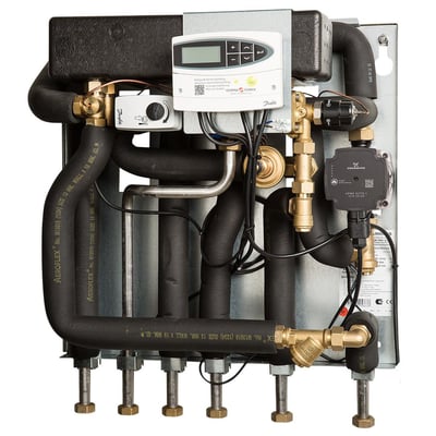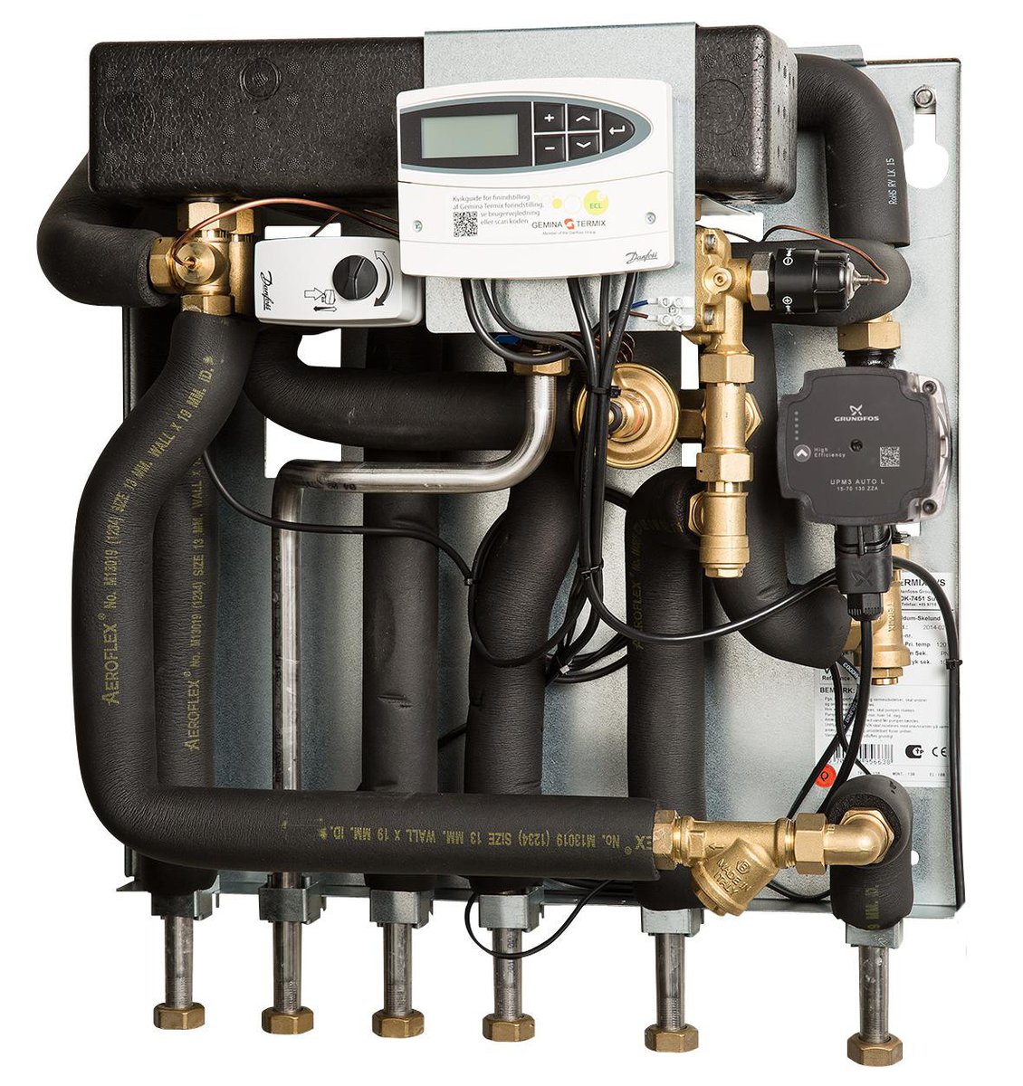 Termix VMTD HS konverter med intelligent TPV-regulator og isolering er en komplet fjernvarmeunit til direkte forsyning med indbygget blandekreds og Danfoss automatik ECL 110.