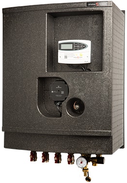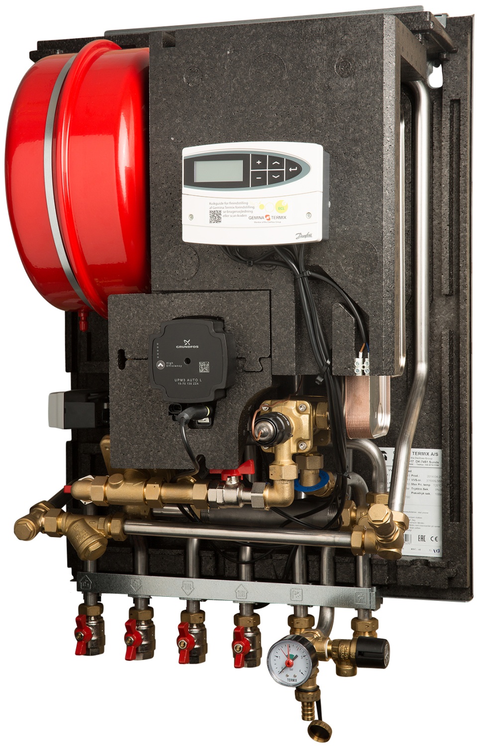 Komplet og monteringsklar fjernvarmeunit fra Gemina Termix til indirekte forsyning med indbygget vandvarmer og varmeveksler. Ideel til installationer, der kræver varmeveksler.